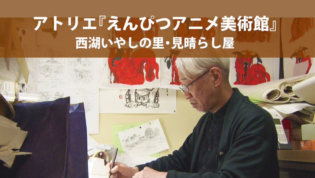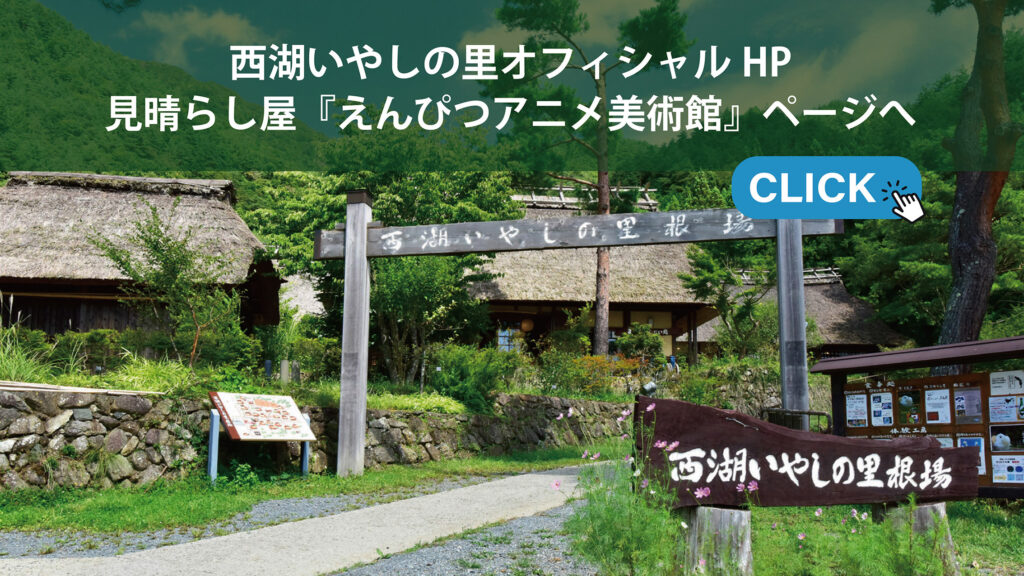 前田こうせいのアトリエ『えんぴつアニメ美術館』は富士五湖のひとつ、西湖の北西に位置する西湖いやしの里根場のなかの施設です。