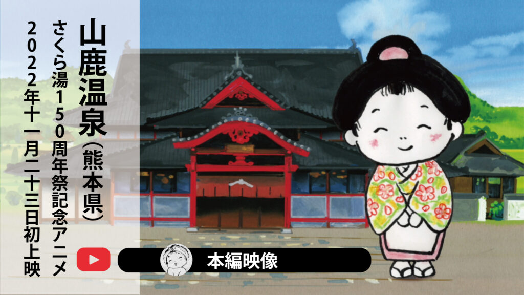 山鹿温泉は熊本県内で最も歴史のある温泉地の一つであると言われ(開湯1000年とも・・)、伝説によると、保元の乱で京都から敗走した宇野親治が山狩りをしていたところ、傷を負った鹿が湯に浸かっているのを見て、この温泉を発見したとされる。温泉名で地域名ともなっている「山鹿」もこの開湯伝説に因む。 山鹿温泉のシンボルとして愛される「さくら湯」は明治5年(1872年)に完成し、2022年で150周年を迎えました。 これを記念して、さくら湯誕生にまつわる歴史のアニメーションを「まんが日本昔ばなし」の演出・作画・監督80本を担当した前田こうせい氏の手によって完成しました。