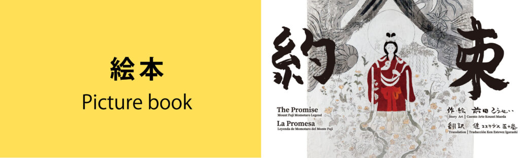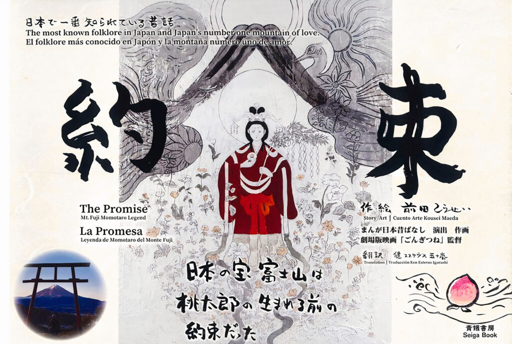 絵本『約束』は、日本人の誰もが知っているお伽噺『桃太郎』のスピンオフであり、日本人だけでなく、昨今は海外からも遠路はるばる人々が訪れ、仰ぎ見る富士山と富士五湖の誕生に光を当てます。だから、この絵本には英語とスペイン語の対訳がつけられています。富士山は知っていても、桃太郎のことは全く知らない世界中の人々にも届くように。